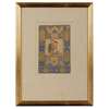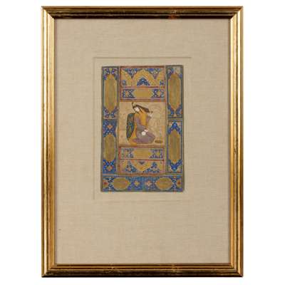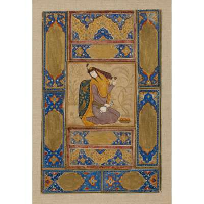 gouache and gold on paper, depicting a lady kneeling and resting against a vivid blue bolster cushion with gold embroidery, holding a cup between two fingers and a metal bottle in the other hand, a bowl of oranges before her, in a landscape covered with flowers and bushes, within a border of cut and pasted panels containing empty gold cartouches on a cobalt blue ground with delicate floral detail, mounted, glazed and framed