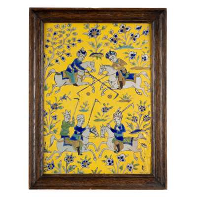 Produced in the cuerda-seca (dry cord) technique, the present pair of tiles depict courtiers having a conversation in a garden and polo players on horseback. The yellow in the background gives a striking look to the pair. Both tiles belong to a much-favoured category found in many pieces of Qajar art, the depiction of courtly life and its activities. Polo, chawgan in Persian, was a game very much enjoyed by the royals in Persia and central Asia. It was introduced to India primarily by Persianate courts. The Mughals played a significant role in spreading polo in India, and it was later adopted as ‘polo’ by the British during the British Raj in the 1850s.