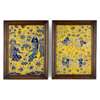 each of rectangular form and decorated in portrait format on a bright yellow ground, one depicting five courtiers in a garden with flowers and water features, two Chinese-inspired cloud scrolls above, the other depicting a game of polo with two horse riders in mid-play scrambling over balls, and three below with their sticks raised above, against a floral landscape, framed