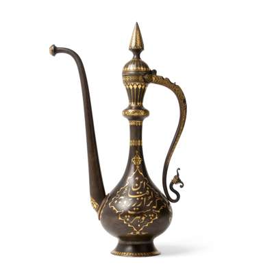 A QAJAR GOLD DAMASCENED STEEL EWER