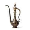of baluster form on a splayed foot, with tall curving spout and ‘S’-shaped handle with dragonhead-shaped terminal, the hinged dome-shaped lid with faceted pointed finial, either side of the body decorated with a cusped cartouche containing inscriptions in nasta'liq