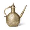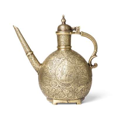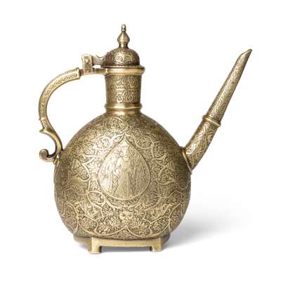 of squat pear-shape, with long protruding spout and S-shaped handle, profusely incised and decorated in low relief in the Qajar-style with images from a Persian Epic, including figures in the central tear-shaped medallion on either side, the remaining body with interlace, cartouches with animals and their prey, and a ground of vegetal designs, two bands of inscription around the neck, comprising verses from the preface of Sa'di's Gulistan