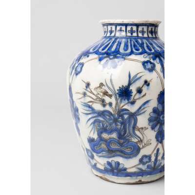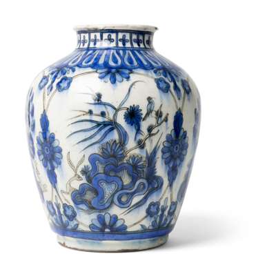 A QAJAR UNDERGLAZE PAINTED POTTERY BLUE AND WHITE JAR
