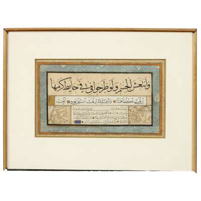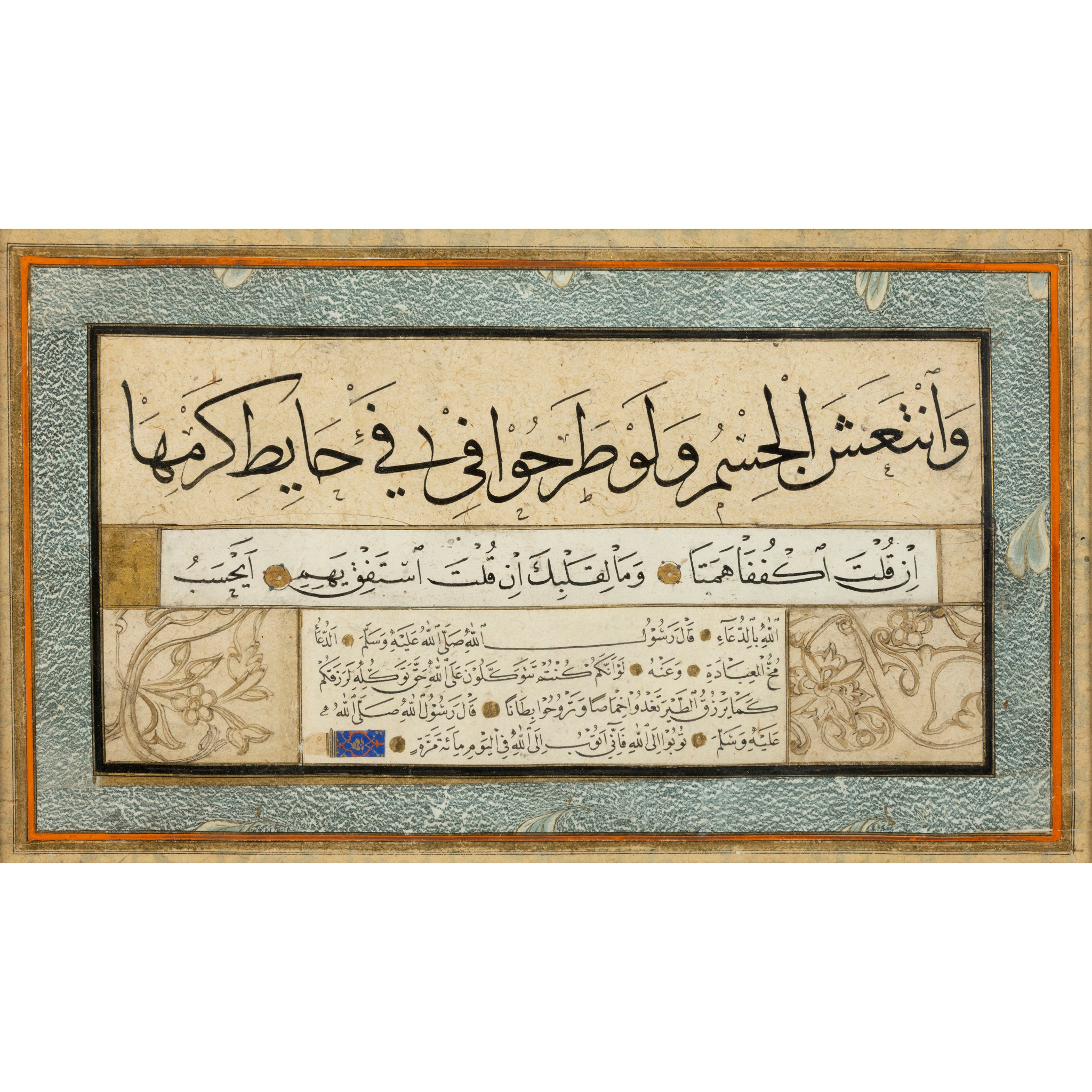 Arabic manuscript and black ink on paper, starting with one line in thuluth script, followed by one line in naskh script with verses separated by gold roundels with blue dots, comprising Arabic verses and a quotation from al-Busiri's Qasidat al-Burda, followed by four lines in smaller naskh script with gold separation dots comprising traditions of the Prophet, the two lower corners with gold floral decoration, blue margin with orange outer rule, mounted, framed and glazed