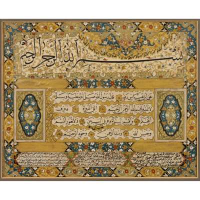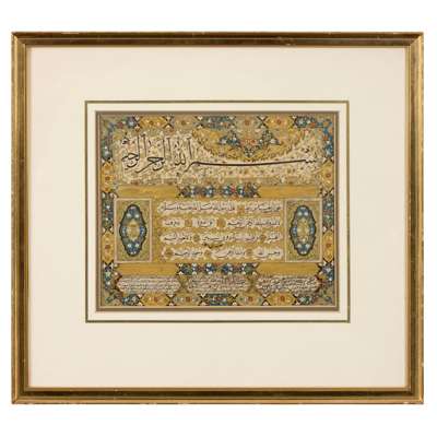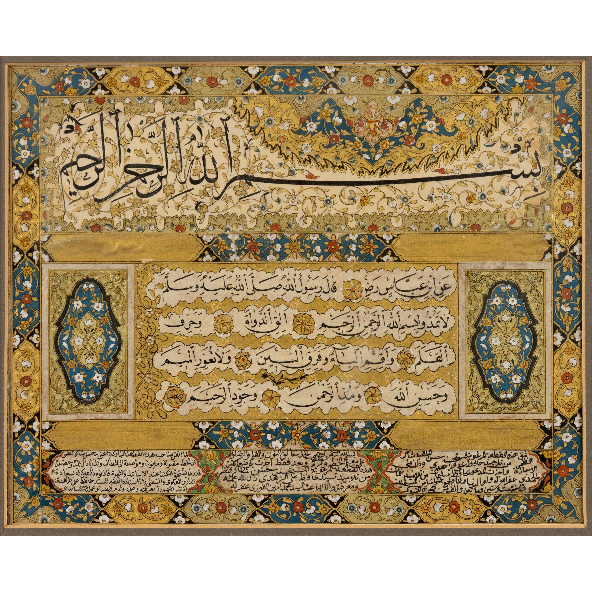 Arabic manuscript on paper, black ink, gouache and gold on paper, the large script in thuluth above proclaiming the bismillah against a a ground of gold scrolling leafy vines, followed by four lines in naskh script, three cusped cartouches below each comprising five lines in smaller thuluth script, the interstices and borders filled with gold scrolling leafy vines and polychrome floral cartouches, outer margin with a band of repeat floral-filled cartouches, mounted, framed and glazed