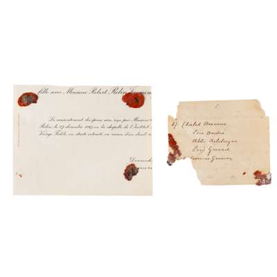 Each of the following three Iznik tiles (lots 43-45) are accompanied by handwritten notes dated to 1905. Whilst two of the notes have been detached from the tiles (see fig. 1a and 1b), they still have remains of the seal wax that was used to attach them. Lot 45, however, still has its note securely attached on the reverse (see fig. 2).