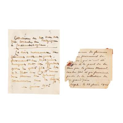 Two of the notes are written in the hand of Count Frederick van der Steen de Jehay (1858-1916), the recipient of the Iznik tiles, who served as a distinguished politician and diplomat. Most notably, he was posted as special envoy to Istanbul from 1897-1905. The end of his appointment coincides with the year these tiles came into his possession, suggesting that they may have been given to him to mark the end of his tenure.