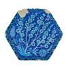 of hexagonal form, underglaze, the main field decorated in white against a dark blue background, with details picked out in turquoise, the primary element of the design is an asymmetrical prunus tree in blossom, growing from a bunch of fleshy saz leaves at the base, from this base also sprout two other stems in the saz style, the right one with a large rosette as well as buds and leaves, and the left stem ending in a distinctive three-petalled tulip decorated with dark blue dots and turquoise teardrop shapes, at the top right is a Chinese-inspired cloud motif, and the borders are of turquoise with a repeat pattern of rosettes in two different sizes