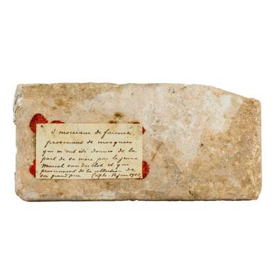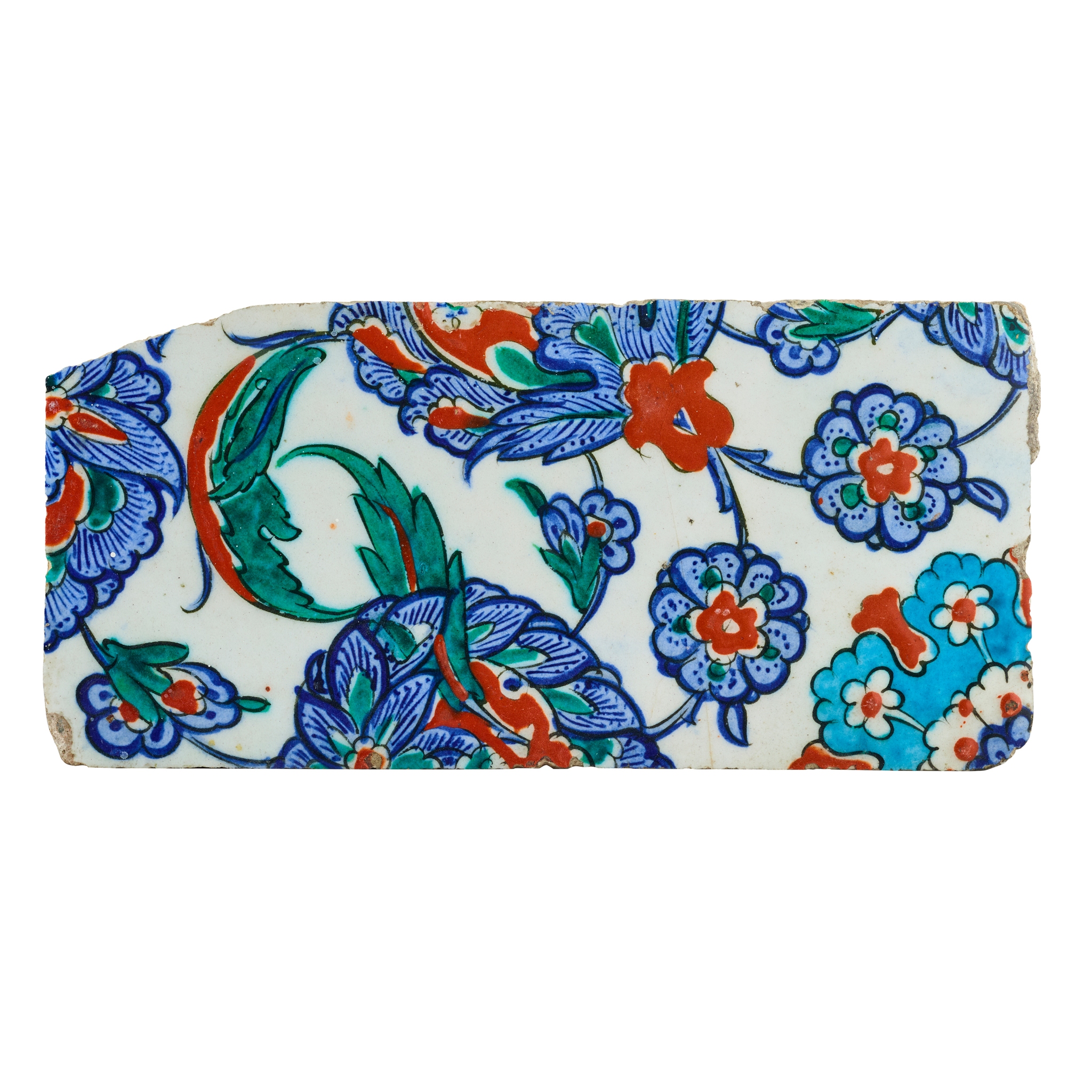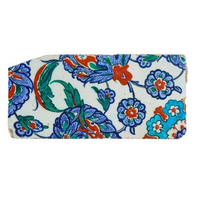 It is unclear exactly which building this tile may have been used in, but it is unmistakably a product of peak-period Iznik in the second half of the 16th century. Close comparison can be made with a panel in the British Museum (see V. Porter, Islamic Tiles, 1995, p.104, no. 97) as well as the tympanums from the Piyale Pasha Mosque, now in the Musée du Louvre (see Makariou, 2012, pp. 347-9, fig. 219). A closely related tile was sold at Christies, Arts of the Islamic & Indian Worlds, 21 April 2016, lot 171.