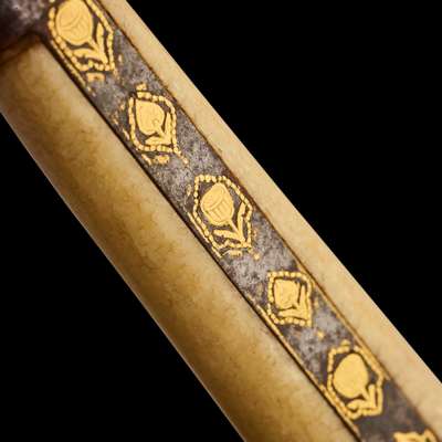 with finely watered steel tapering blade, with walrus-ivory hilt, the forte and spine decorated in gold overlay with floral motifs, one side of the forte with a date in hiji, the other side inscribed with ‘The work of Muhammad Hadi’