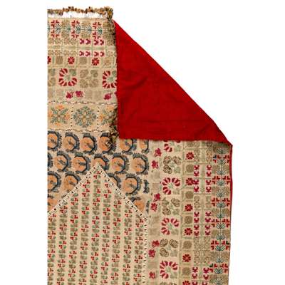 of rectangular form, the cream linen ground embroidered with red, coral, and dark blue silk threads, tassels on either end, backed in red