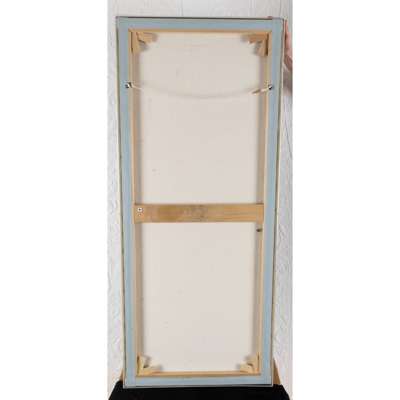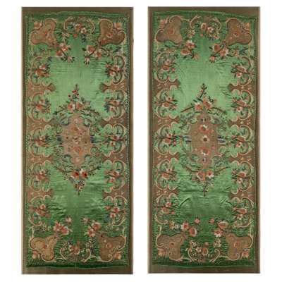 each of rectangular form, the green silk ground embroidered in gilt and silver threads, and polychrome silk threads, with a central cusped and stylised cartouche comprising flower heads, the border with a repeat design of floral swags all in the rococo-style, mounted on silk panel on stretcher, in perspex cover