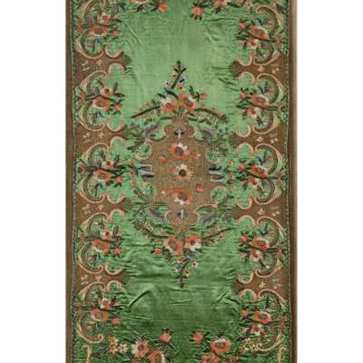 The present luxurious pair of green silk covers, richly embroidered with silk and precious metal threads, were probably used for interior decoration or as furnishing covers during social or ceremonial gatherings. The shape may indicate that they could have been used as mirror covers. For other Ottoman silk mirror covers please see, K. Belger, Flowers of Silk & Gold: Four Centuries of Ottoman Embroidery, Merrell & The Textile Museum, Washington D.C., 2000, cats. 27 & 29.