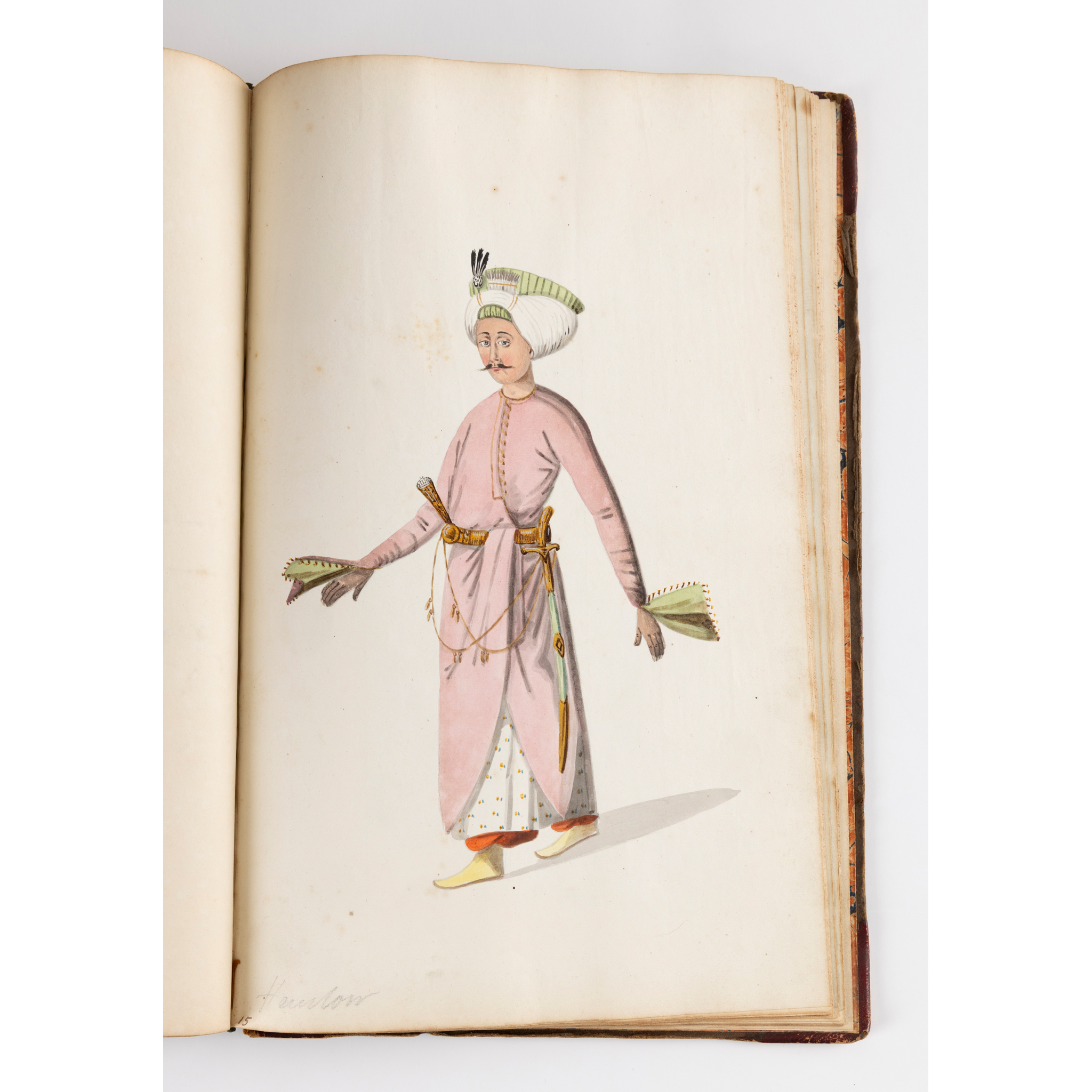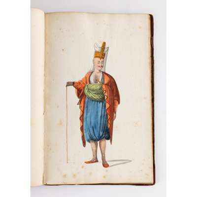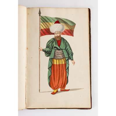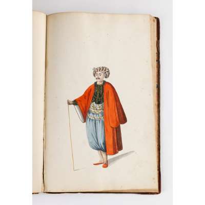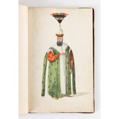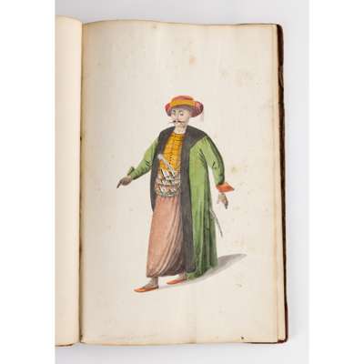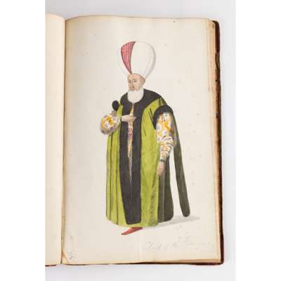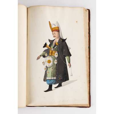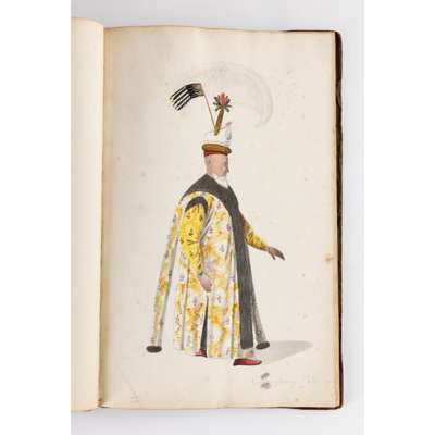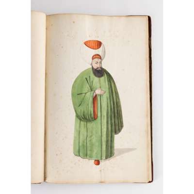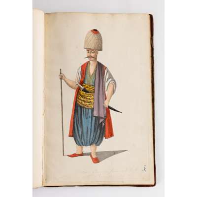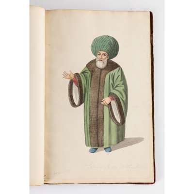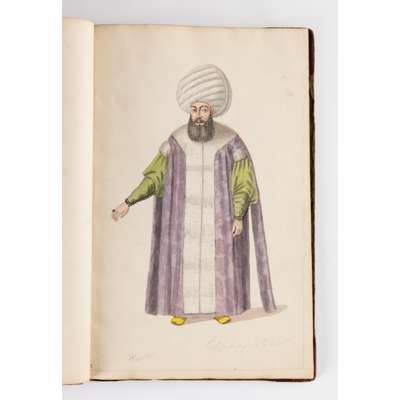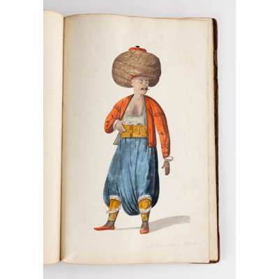 bound album, watercolour on paper, each numbered in ink, inscribed in pencil in English and on verso in French with their identifying position including a Judge, a city magistrate and members of the janissary army