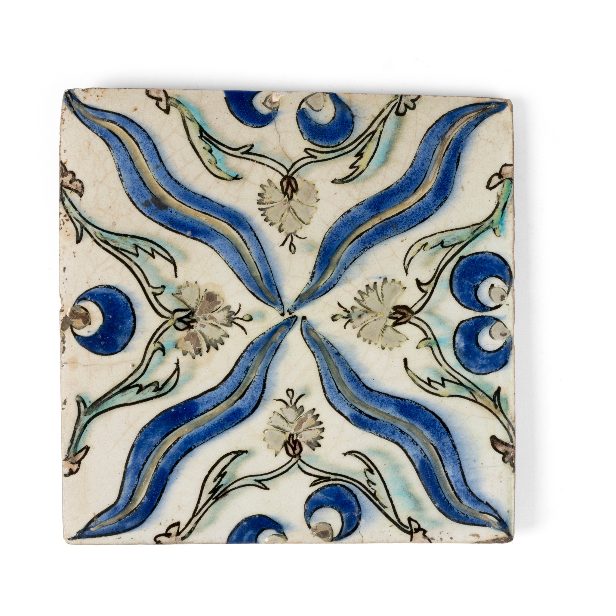 of square form, decorated predominantly in blue and green with an X-symmetrical pattern comprising four wavy stripes, double crescent balls and carnation stems