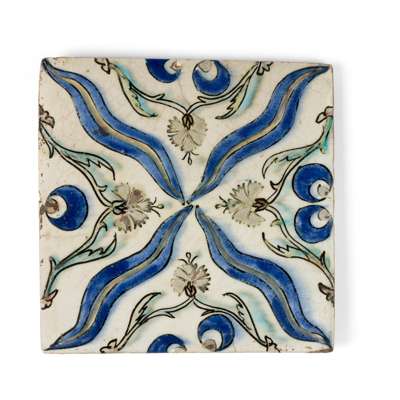 AN OTTOMAN UNDERGLAZE PAINTED POTTERY TILE DECORATED WITH CINTENAMI