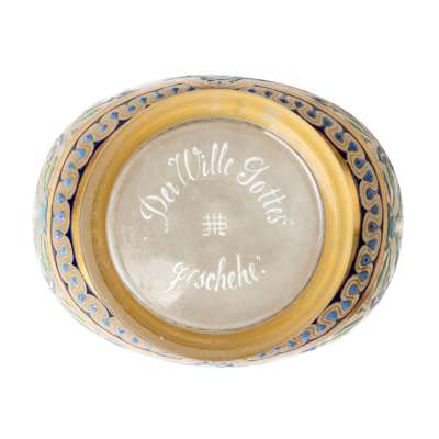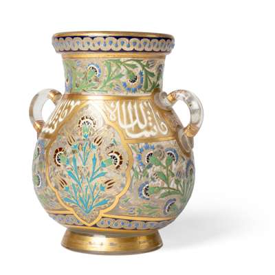 of baluster form on splayed foot with loop handles to either side of cylindrical neck and shoulder, the body enamelled in gilt, green, blue, black and white with two cusped cartouches comprising Iznik-style floral sprays of tulips and carnations, the remaining body and neck with further floral sprays, the shoulder with a wide band of Arabic calligraphy in white, underside signed with Lobmeyer monogram and around it, inscribed in German with: ‘Der Wille Gottes geschehe'