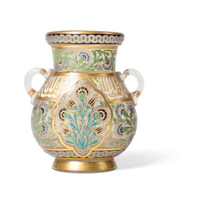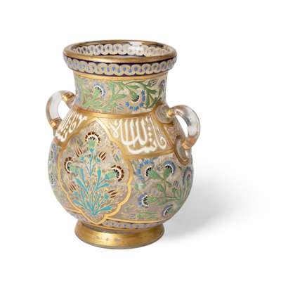 An almost identical vase, with the same inscription and colour scheme sold through Christie's, see, Art of the Islamic and Indian Worlds, 8 April 2008, lot 152. Another example is in the Khalili Collection, see S. Vernoit, Occidentalism, London, 1997, no. 176, p. 227. For an Iznik-style dish sold through our rooms and a further discussion on Lobmeyr, see Islamic and Indian Art, 11th December 2024, lot 50.