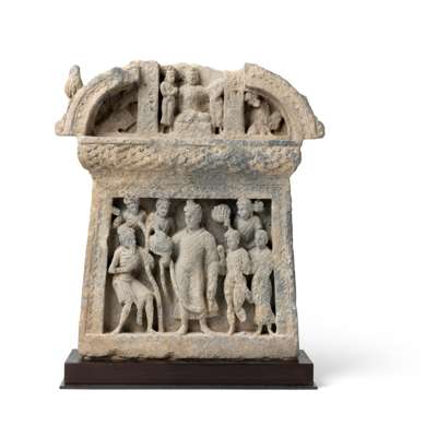 grey schist stone relief, carved in deep relief with Buddha Dipankara to the centre, flanked by further figures within a sawtooth border, on stand