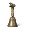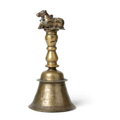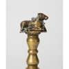 cast of typical form, the ribbed handle surmounted by a cast seated figure of the bull, Nandi