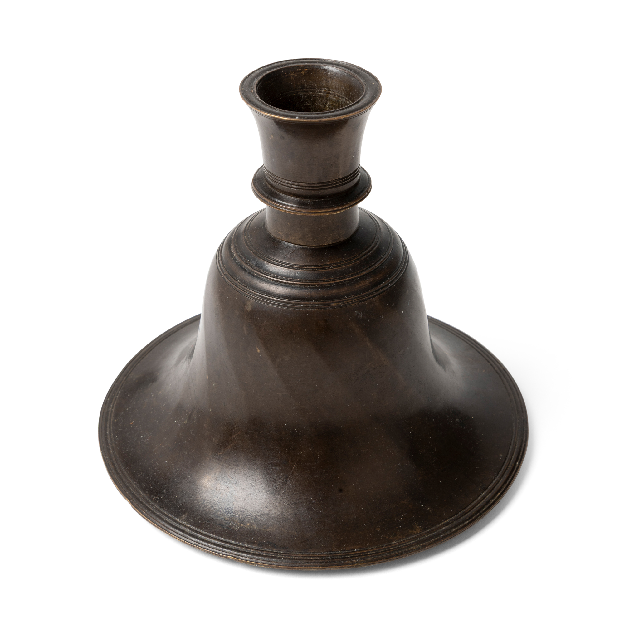 cast of typical bell-shaped form, the body with elegant radiating panels, the slightly tapering neck with a raised rib