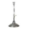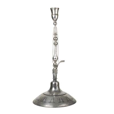 comprised of a large splayed base surmounted by a 19th century bell-shaped hookah bottle, from which issues a long silver stem with an elaborate succession of drop-shaped, spherical and tapering elements rising to the furnace in a poppy-bud form, the decoration with stylised flowers within cusped medallions
