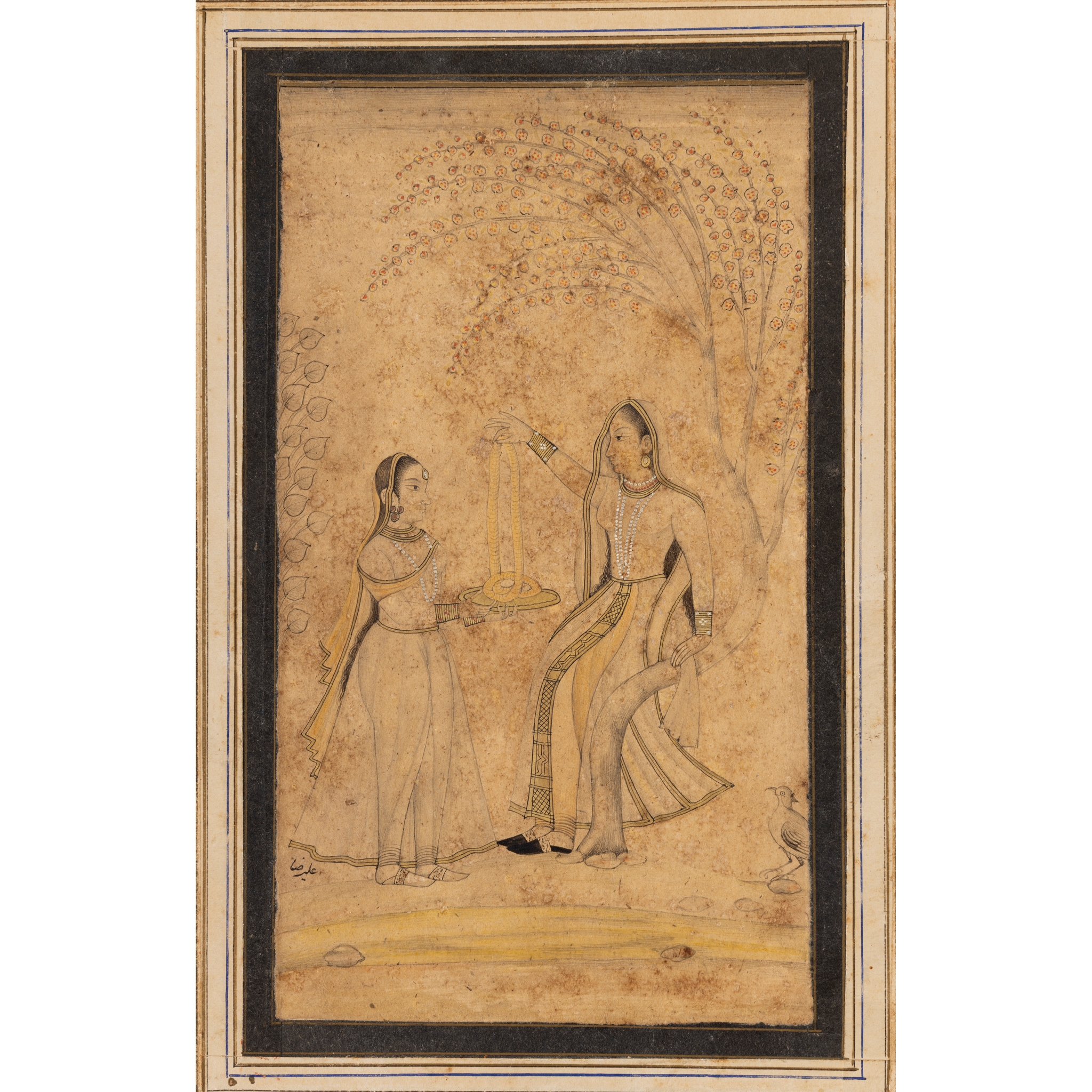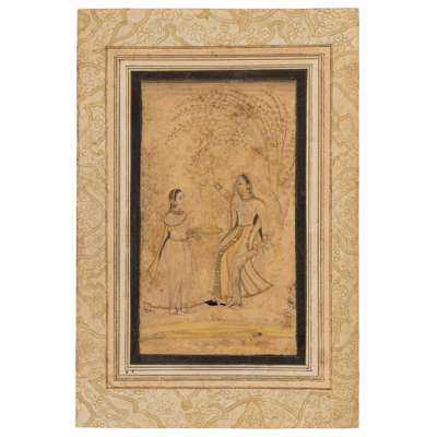 ink and watercolour on paper, detailed highlights in white, within a gold-lined black border, further blue and gold margin rules, gold decorated border, depicting a Nayika stringing garlands offered on a tray by a female attendant under a blossoming drooping tree, signed in ink lower left in Persian with ‘Riza’, verso inscribed with a Mughal Raqam mark