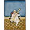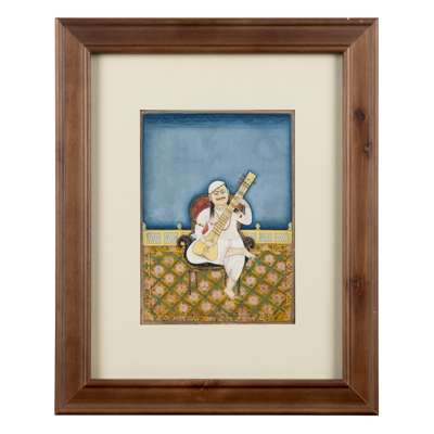 watercolour on paper, depicting the musician seated in a European-style chair on a green and pink carpeted terrace, mounted, glazed and framed