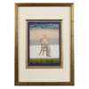 gouache on paper heightened with gold, dark blue border with red margin lines, depicting the ruler seated in a European-style chair on a palace terrace, facing right holding a rose, formal gardens in the background, mounted, glazed and framed