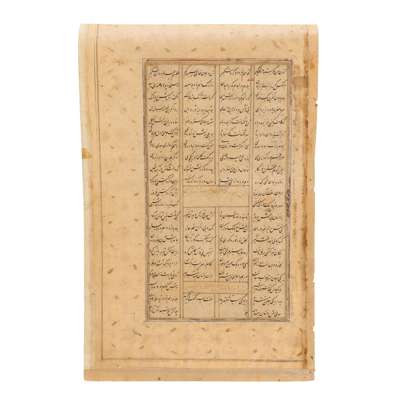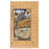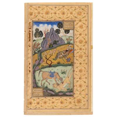 gouache heightened with gold and ink on paper, with an elegant gold and polychrome decorated border with a floral lattice design, the image with red, gold and blue rules depicting Rustam dressed in his tiger-striped tunic, his head resting on his shield on a blue striped cushion, his eyes closed in deep sleep, holding a sword in his right hand, his xxx of arrows to his left, in the foreground his faithful horse, Rakhs, is seen biting into the back of a lion, all within a rocky, wooded and green landscape, verso with text in nasta'liq divided into four columns