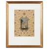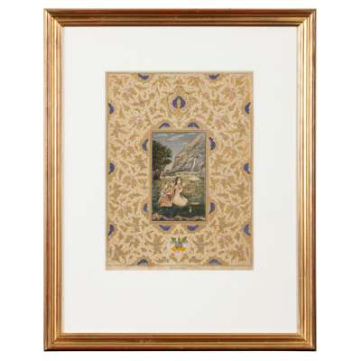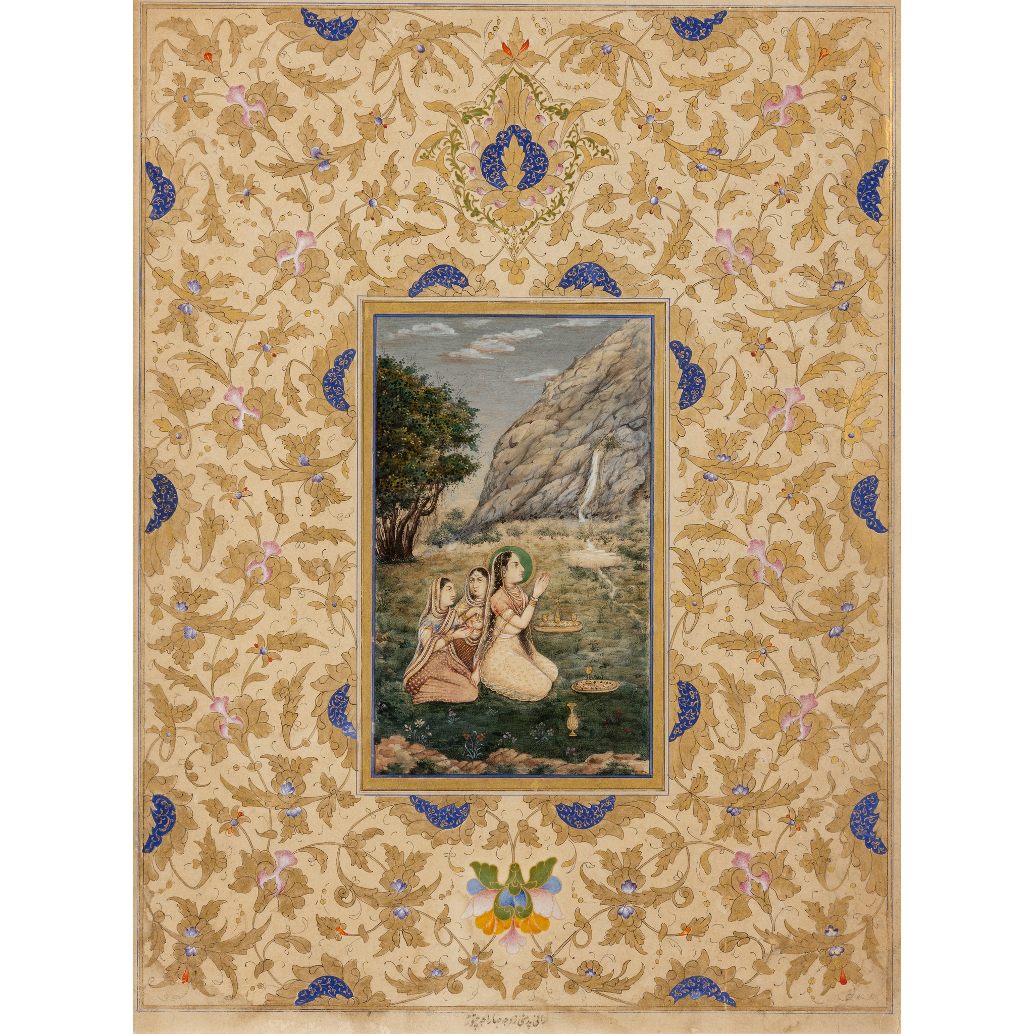 gouache on paper, mounted on an album page with illumination in colours and gold, depicting a princess at worship at the side of a waterfall flowing from a hillside, wearing a transparent dopatta draped over her choli and sari, her hands raised in worship with trays of artefacts of worship before her, two female attendants kneeling at her side, the edge of the album page inscribed ‘Rani Padmini’