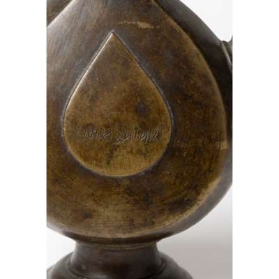 cast bronze on a flared foot, the tear-shaped body with hinged-domed lid, tear-shaped design moulded in relief on either side of the body, with S-shaped faceted handle and spout, owner's inscription in nagari on one side