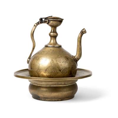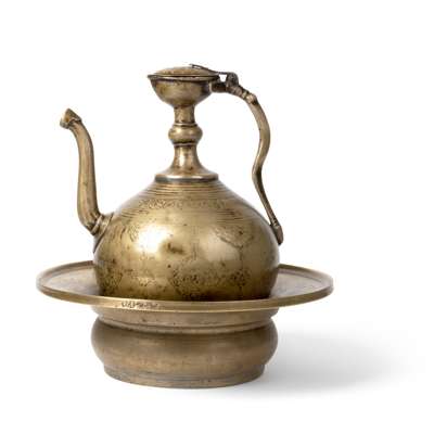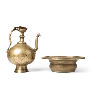 A PERSIAN-STYLE MUGHAL BRASS EWER AND BASIN