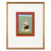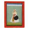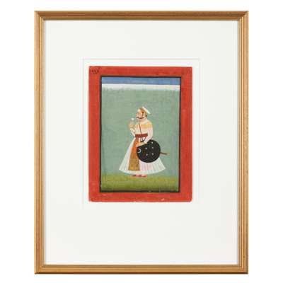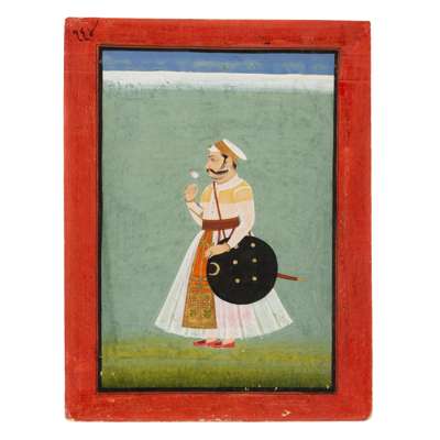 gouache on paper heightened in gold, red border with black margin rules, the nobleman holding a flower standing facing left, wearing a white turban and jama, a floral patka tied around his waist, a sword and shield hanging from his shoulder