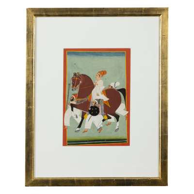 The canter of the stallion and the running steps of the retainers alongside give movement and rhythm to this fine equestrian portrait of the young maharaja. For a comparable painting, see R. Crill, Marwar Painting, A History of the Jodhpur Style, Mumbai and Jodhpur, 1999, fig. 93.