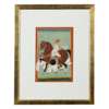 gouache and gold on paper, red and inner yellow border, the young Rajput prince riding a bay horse richly caparisoned in procession to the left, three retainers running alongside, the maharaja wearing a red turban and white jama, the retainers also dressed in white, verso with nagari inscription, mounted, framed and glazed