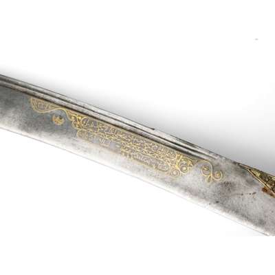 the gently curving single-edged steel blade with silver gilt filigree decoration on the forte set with green-coloured stones, one side of the blade with gold damascened stylised cartouche containing Arabic inscriptions, with walrus ivory hilt, the wood scabbard mounted in repoussé silver profusely decorated in relief with repeat rocaille designs