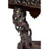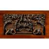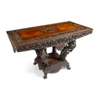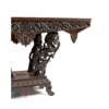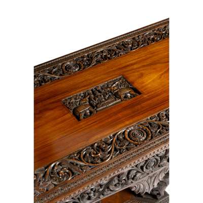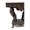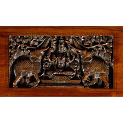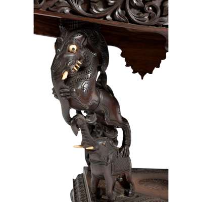 of rectangular form, the top surface with a central panel depicting the Lustration of the Goddess Lakshmi within a border of lotus, vines and birds, the table supported on four brackets, each depicting a mythical beast, Vyala, on top of an elephant, with trunks entwined, each bracket resting on a square base with a lotus carved at the centre