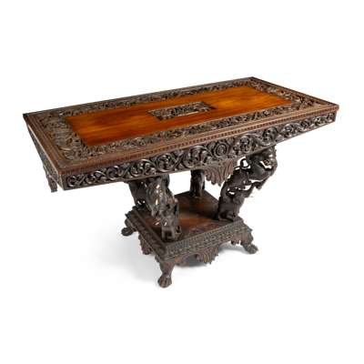 A FINELY CARVED ROSEWOOD, EBONY AND IVORY CENTRE TABLE Y