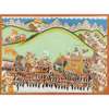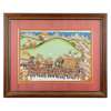 gouache on paper heightened in gold, black margin lines, yellow and red border, a line in black nagari script within the green background, depicting the maharaja upon a luxuriously caparisoned elephant with three princes leading the procession astride their horses, with several rows of footmen with their shields and swords in the foreground, followed by rows of horsemen to the right, hills and rocky landscape in the background, with further processions in the distance, mounted, glazed and framed