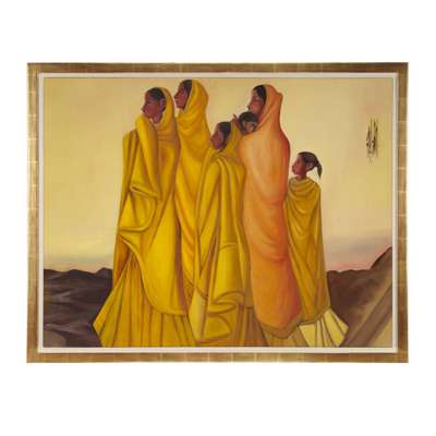 This striking example of Prabha’s work embodies all the qualities of her signature style. Graceful, elongated figures of pensive rural women beautifully articulated in oil and dominated by a single colour. Prabha started working at a time when India had few women artists. Deeply inspired by the work of seminal modernist Amrita Sher-Gill, she chose to focus on the plight of rural women providing an intimate snapshot into their lives. By the time of her death, her work had been shown in over 50 exhibitions, and had found its way into significant art collections, including India's National Gallery of Modern Art, the TIFR Collection and the Air Indian Collection. Set against a wild back drop this group portrait portrays Indian women and children with beautiful flowing robes, profiled from the side and eyes fixed on the horizon.