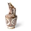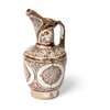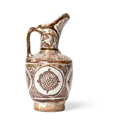 of pear-shape with cylindrical neck and upward pointing spout, decorated in a brownish-honey coloured lustre on a white ground, with pseudo kufic inscriptions around the sloping shoulder, and a band of four large circles with criss-cross motifs around the body