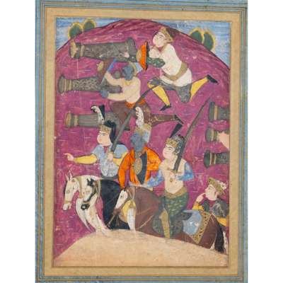 gouache and gold on paper, laid down on on an album page with gold sprinkled blue outer borders, depicting three soldiers on horseback with their swords upright in the foreground, and two footed soldiers attending to canons above, all facing to the left in preparation for battle, on a purple ground