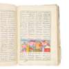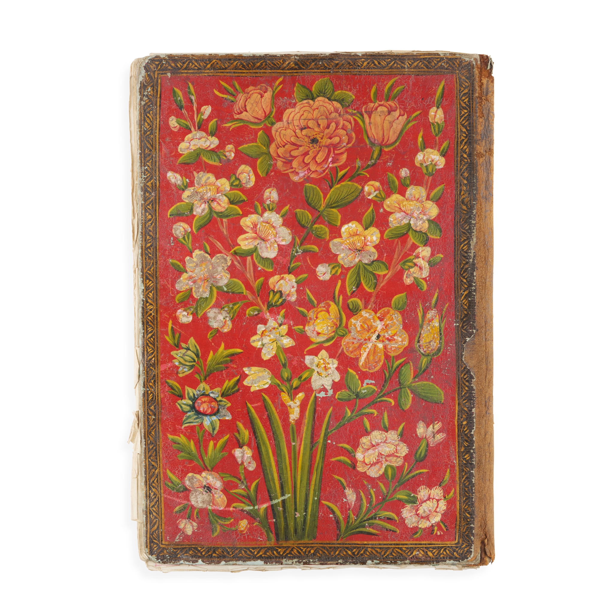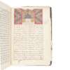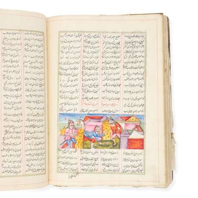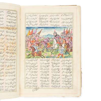 Persian manuscript in black ink on polished laid paper, nasta'liq script, text in 4 columns with 24 lines to the page, rubricated headings, illustrated with an illuminated floral headpiece to first page and 34 illustrated folios in gouache depicting the deeds of ‘Ali ibn ’Abi Talib and his companions (mainly 6 x 15cm to 11.5 x 15cm, one larger, 17 x 16cm, one full-page, 22 x 15cm), text within concentric red and gold frames with columns ruled in red, contemporary floral lacquer binding, rear board partly detached, damp-staining around ff. [55]-[65], a few damp-stains elsewhere