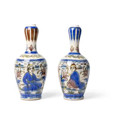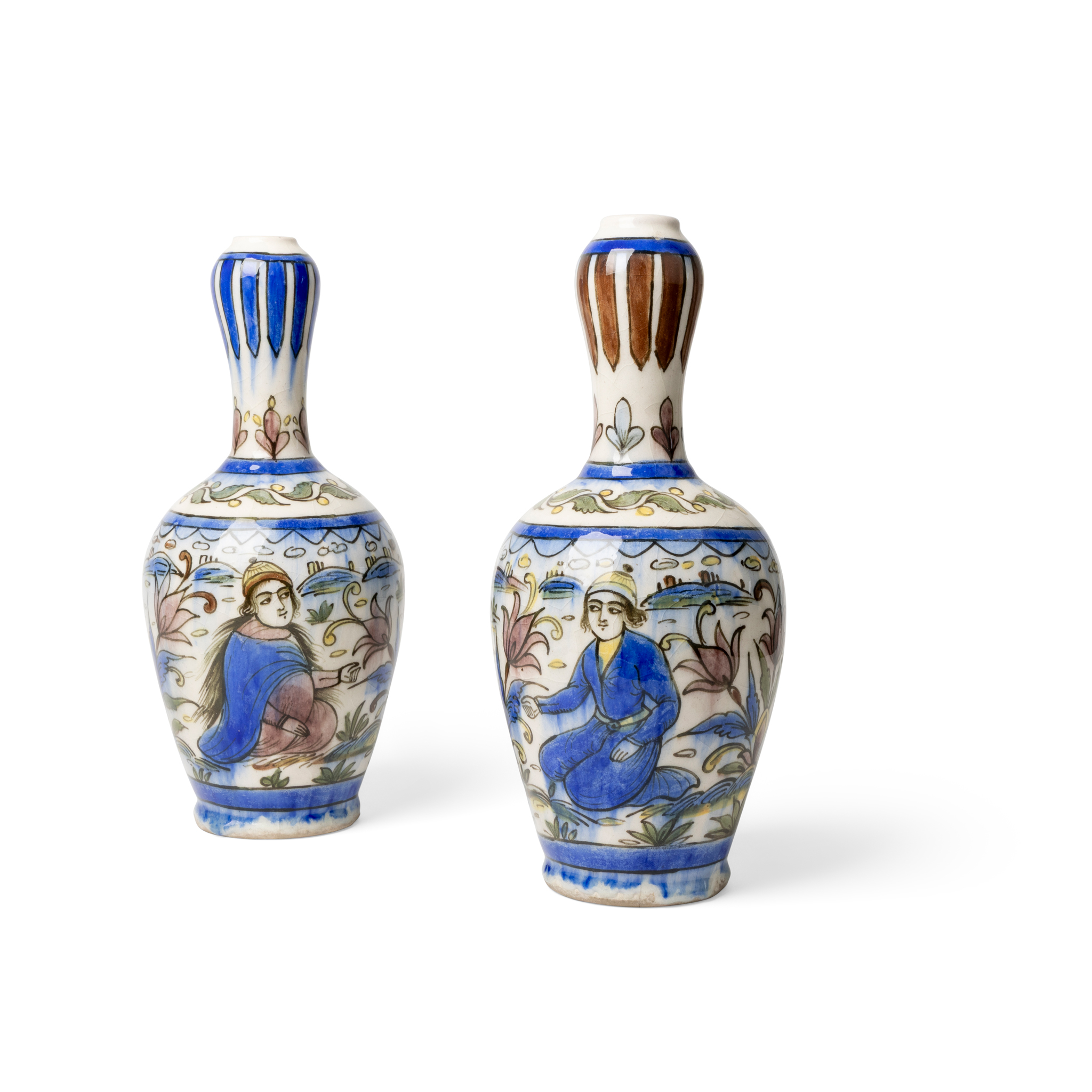 A PAIR OF QAJAR UNDERGLAZE PAINTED POTTERY TULIP VASES
