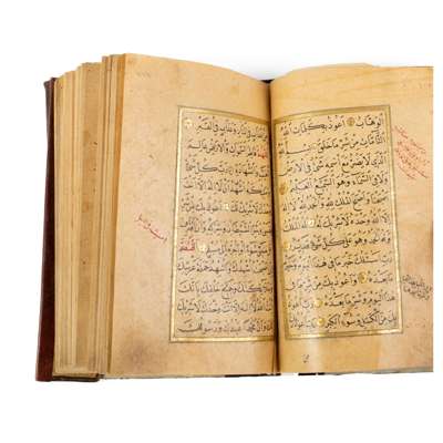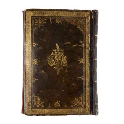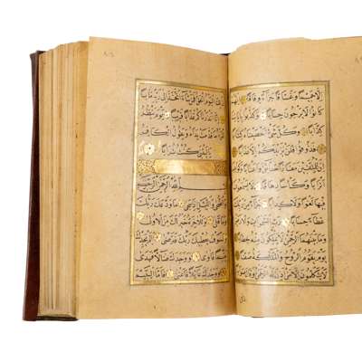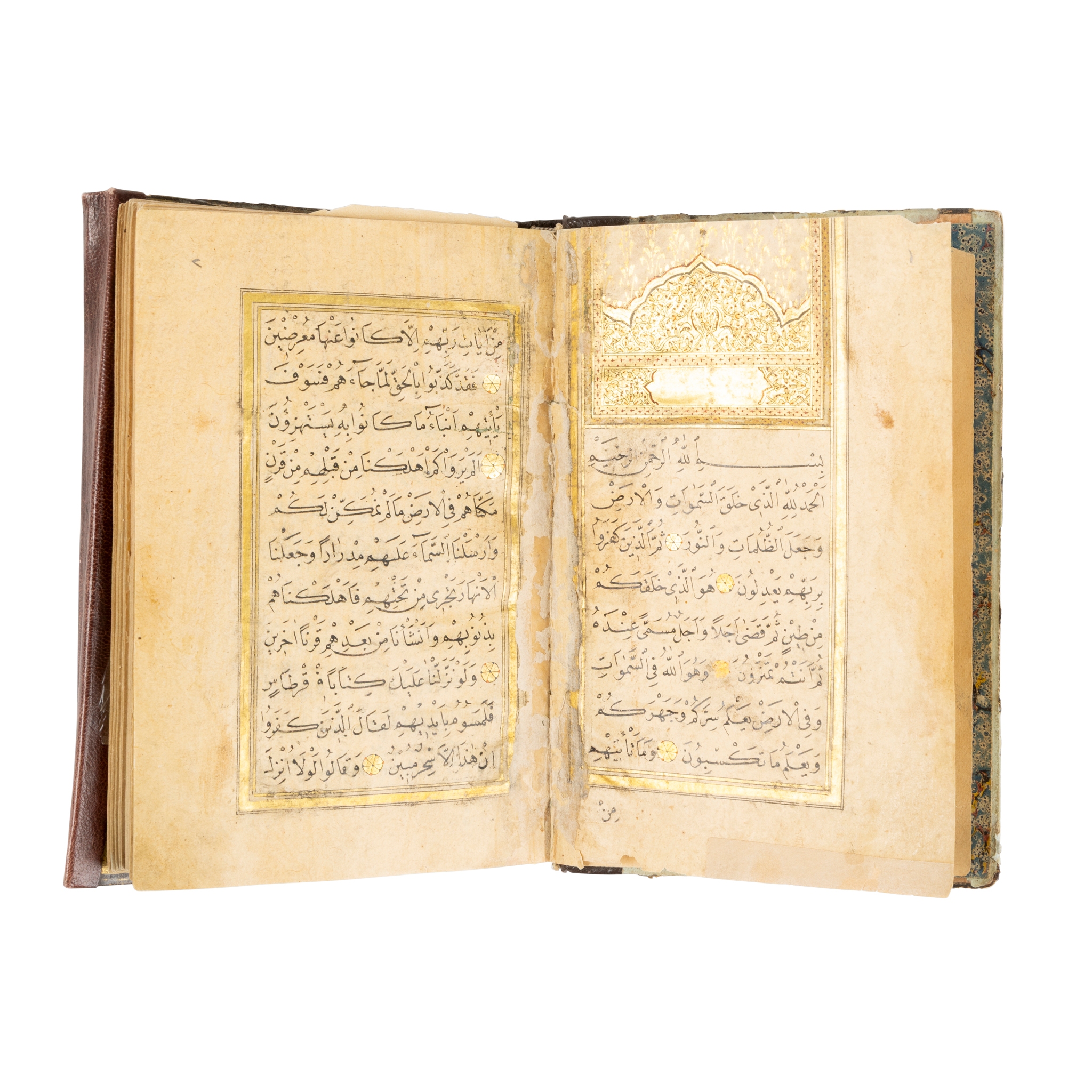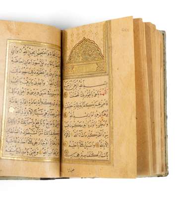 Arabic manuscript on paper, 158 leaves, 11 lines to the page written in elegant naskhi script in black ink, black and gold margin rules, gold rosettes verse separators, illuminated frontispiece, illuminated headings, consisting of a selection of prayers including the Hizb al-A'azam of ‘Ali al-Qari, the Hizb al-Wiqaya of Ibn ’Arabi, the Hizb or Ward of al-Nawawi, and the Dala'il al-Khayrat of al-Jazuli, in addition to selections from the Qur'an, with gilt-decorated contemporary binding, pencilled numbers in Arabic in the upper corners