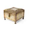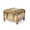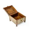 of square form with hinged and sloping lid, on four domic feet, the sides decorated with bands of Arabic calligraphy, the borders with meandering foliate and arabesque designs, the interior elegantly decorated with geometric wood marquetry