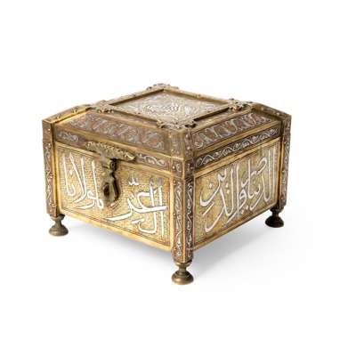 A MAMLUK REVIVAL SILVER AND COPPER INLAY BRASS CASKET WITH DEDICATIONS TO SULTAN AL-NASIR