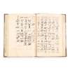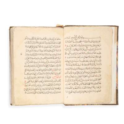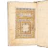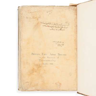 Arabic manuscript in black ink on polished laid paper (mainly with laid lines only, a few leaves possibly with chain lines in clusters of two), [2] 1-118 [2] 119-365 folios and 2 flyleaves, naskh script, 15 lines to the page, rubricated headings and keywords throughout, section- and emphasis-markings in red, illuminated and polychromatic title-page in blue and green pigments and gold containing concentric strapwork and floral frames, enclosing title cartouche with ‘Kitab Hizam fi’l-Baytarah' written in gold muhaqqaq script, and quatrefoil dedication panel with text written in naskh script in black ink within cloudbands on hatched background (the leaf pasted onto recto of first text leaf, quatrefoil panel possibly supplied and laid down), double-page decorative table of horse brands to pp. 96-7, catchwords to about p. 280 (all aligning), later inked pagination to upper corners (probably by an English hand, 18th or early-19th century), with 2 additional manuscripts bound in at rear, both probably 19th century, each with later title in English in blue ink to initial blank ('Turkish M.S.S. History of certain Kings in the year of the Hegira 1011', 11 ff., and ‘Jami-i-Geetee Numa or Mirror of the World, Arabic M.S.S.’, 25 ff., in Persian with interlinear translation in Latin, late-19th century or early 20th-century British binding of half calf lettered on spine ‘Abee Beyam on the Science of Horsemanship, Arabic M.S.S.’, title-page smudged and marked, backed onto first leaf of text with delamination to lower fore corner, variable damp-staining to corners throughout, with concomitant softening of paper to final 15 or so leaves