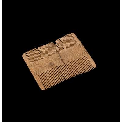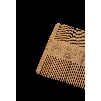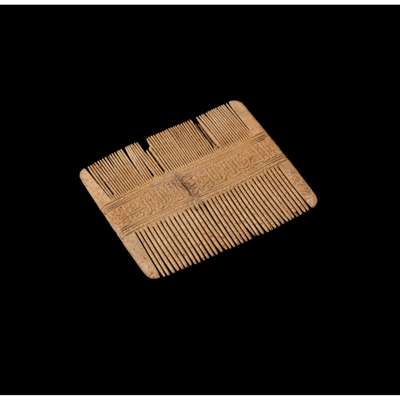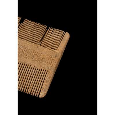 In terms of the inscription and decoration, the closest comparable comb is in the Metropolitan Museum of Art (inv. no. 38.118.17), which is attributed to 13th century Egypt. This features a very similar (albeit much shorter) cursive inscription, as well as the distinctive drilled concentric circles used to decorate the present example (A. Schimmel, "Islamic Calligraphy" in Metropolitan Museum of Art Bulletin, n.s., vol. 50, no. 1 (Summer 1992), pp. 23, 26 fig. 31).